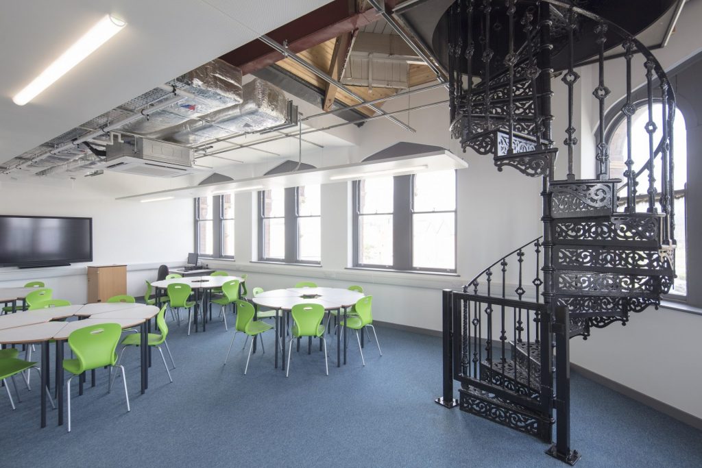 The iconic industrial building was formerly the Alf Cooke Printworks, but had been empty since the works closed in 2006. Working closely with planning and conservation officers, significant historic aspects from the original building were preserved and enhanced during the restoration and became features of the new campus building.